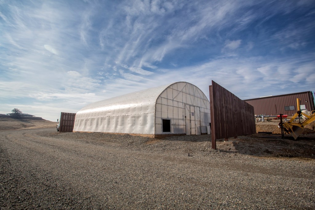The second shop on the property is 600 sq ft, complete with a full bathroom, fireplace and air conditioning unit, and a roll-up door. The fireplace runs off natural gas captured on the property itself, and is in the process of being converted to wine storage.