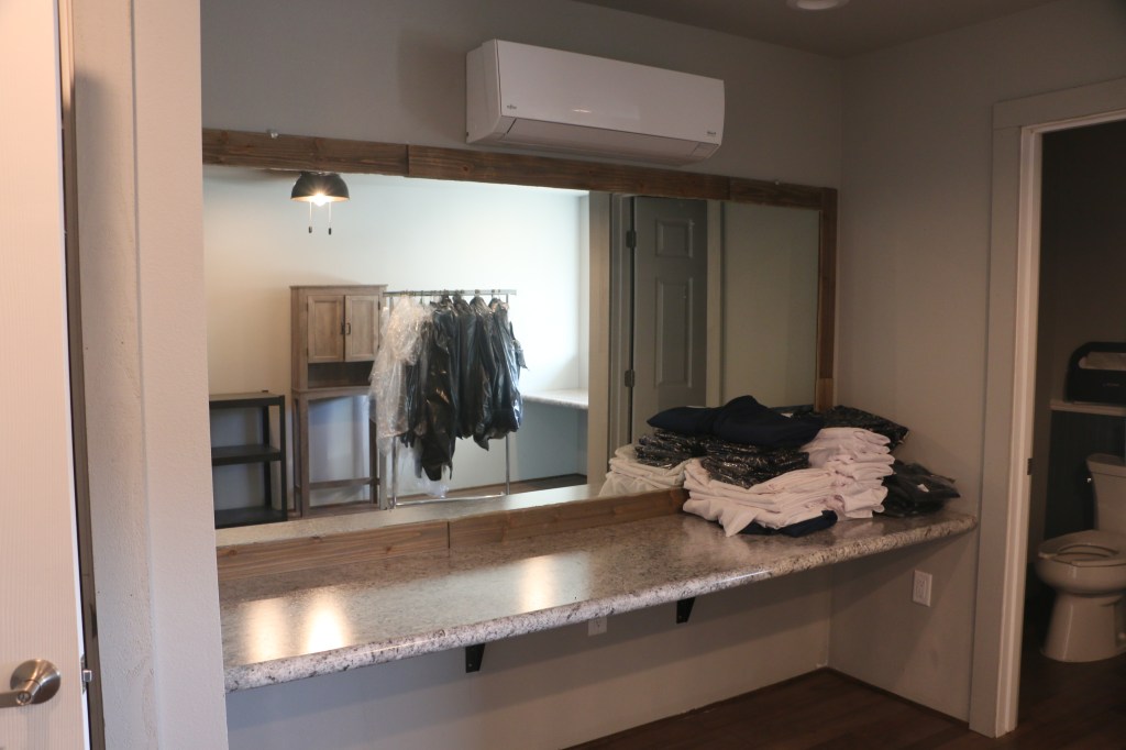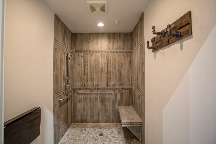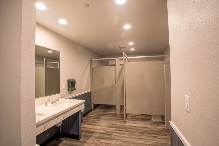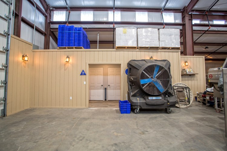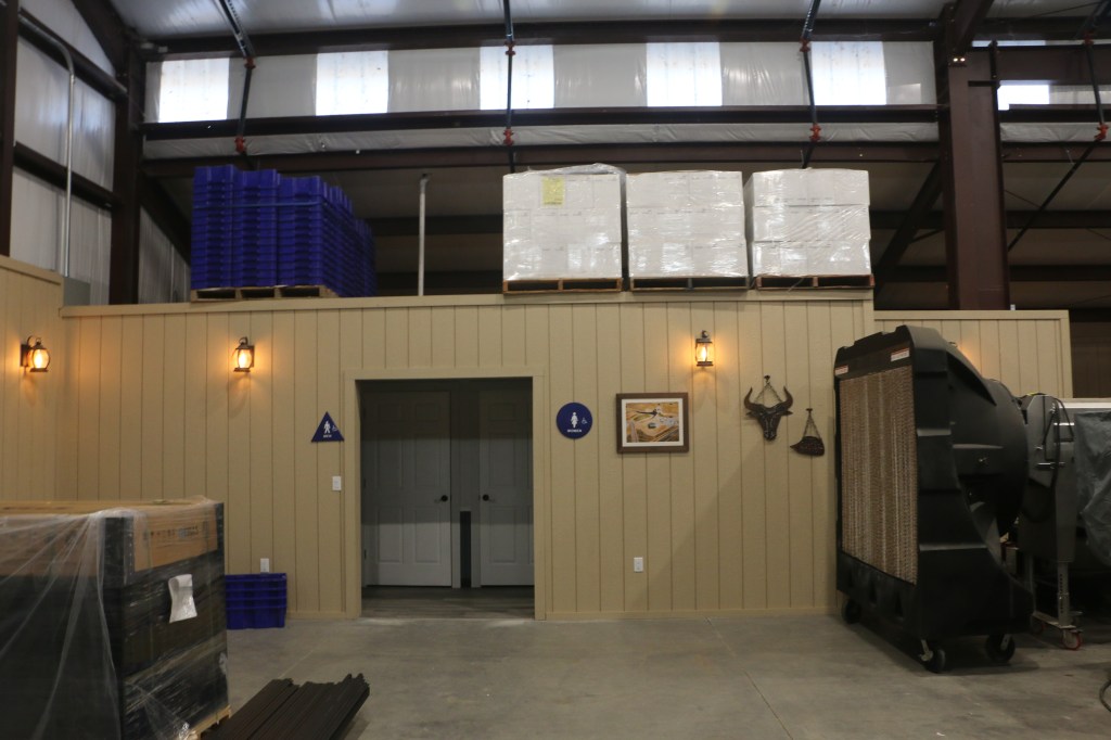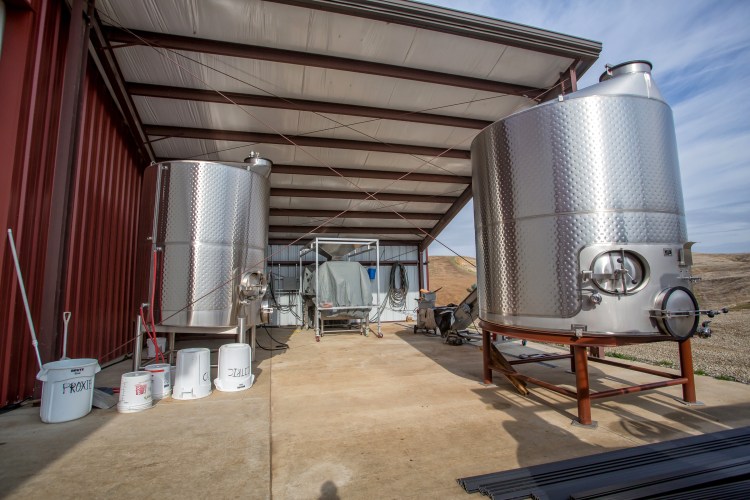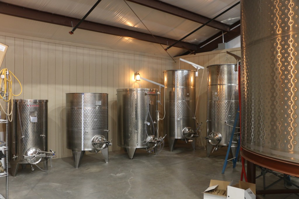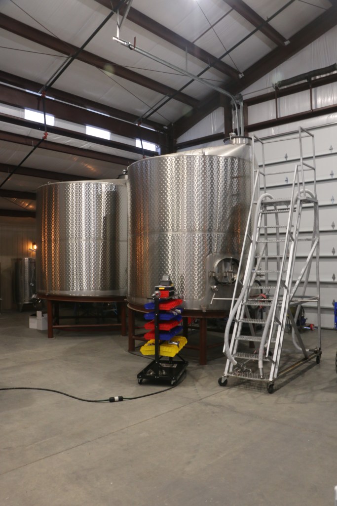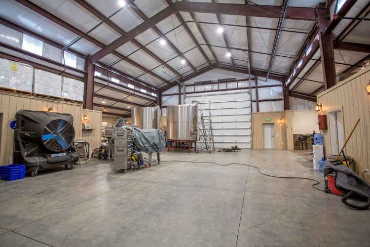 The winery is housed in a 4,560-square-foot metal barn which doubles as an event space. Built in 2019, the barn and extended pad behind it serve as the majority of the grape processing, fermenting, and racking space. Two office spaces are on one side and on the other are dual ADA-compliant, four-stall bathrooms. The winery also has three ADA-compliant shower stalls with tiled walls and pebbled floors. Each has a folding countertop and towel hooks.